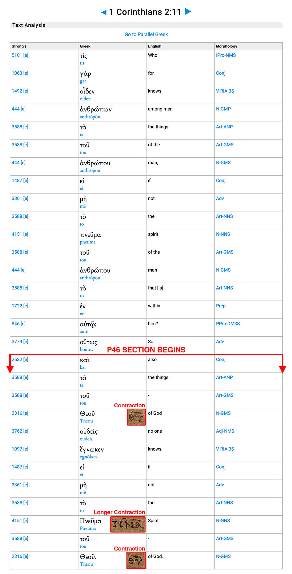 The papyrus text begins in the middle of verse 11 in the second chapter of 1 Corinthians, marked “P46 SECTION BEGINS” in the screen capture from Bible Hub. We see that the interlinear Bible displays God as Θεοῦ (Theou), and Spirit as Πνεῦμα (Pneuma), without contraction and without any indication to readers that these words existed long ago — perhaps even originally — as nomina sacra. I have inserted, into the Bible Hub screen capture, the corresponding nomina sacra from the papyrus: two contractions of God (ΘΥ, theta-upsilon) and one of Spirit (ΠΝΑ, pi-nu-alpha). So Comfort indeed seems to be onto something. Without the enduring Christian art that contains them, how would anyone today still know about the nomina sacra?