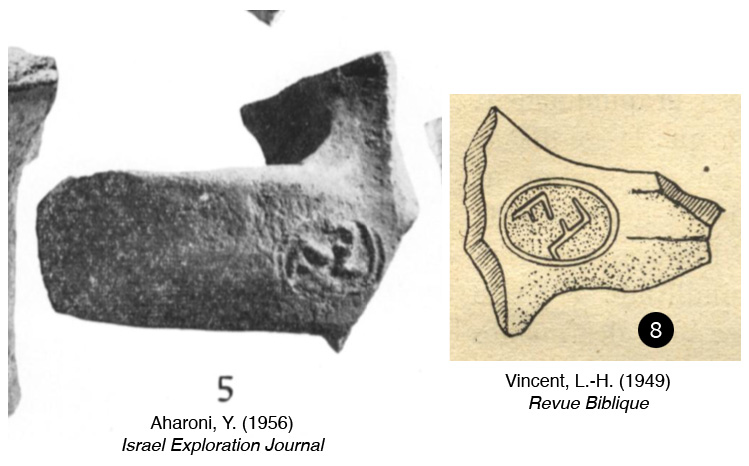 The four images below consist of published pottery inscriptions and two additional jar stamps. To help interpret these inscriptions and stamp impressions, I’ve coupled their images with line drawings made by French archaeologist Louis-Hugues Vincent from his 1949 review (French) on Judean epigraphy. Below these images is a summary based on translations made by Gérard Gertoux.